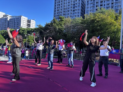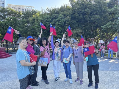8點時間一到,由鄭淑敏區長站主席位,蔡淑君與曾冠一擔任升旗手,緩緩將國旗升起,場面既溫馨又隆重,很多人更是全家大小一起出動,眾人手持國旗,共同高唱國歌和國旗歌,展現對國家的熱愛。